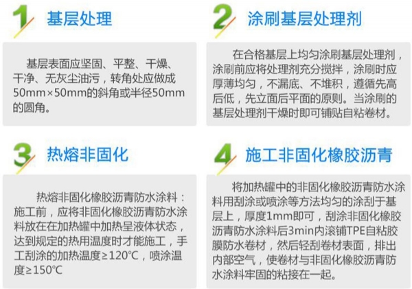 應(yīng)用范圍非固化橡膠瀝青防水涂料既可用于新建防水層,也可用于修復(fù)受損防水層;既可用于常規(guī)區(qū)域的防水,也可用于變形縫等特殊區(qū)域的防水,相對于其它防水材料,它對特殊區(qū)域的防水具有獨(dú)特優(yōu)勢。由于它具有自行封閉能力,可自行修復(fù)防水層的破損部分,破損部位周圍的橡化瀝青非固化防水涂料會自動流動并填充到受損部位,阻斷防水層與混凝土基面間的漏水及滲流。