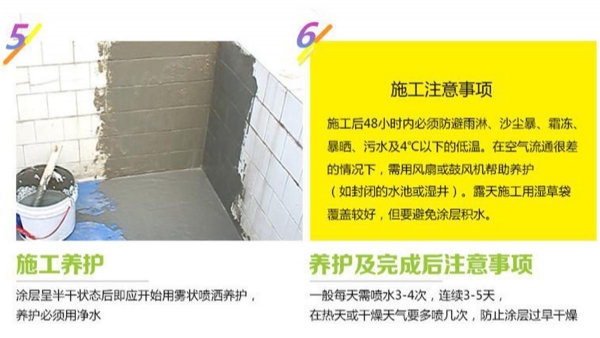 底層完全固化、完好、沒有灰塵,清除浮漿、油、油脂、脫膜劑及其它會影響防水效果